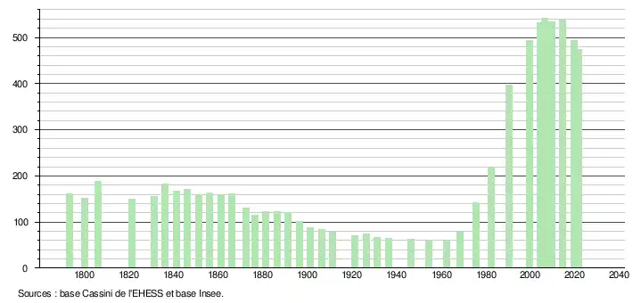 L'évolution du nombre d'habitants est connue à travers les recensements de la population effectués dans la commune depuis 1793. Pour les communes de moins de 10 000 habitants, une enquête de recensement portant sur toute la population est réalisée tous les cinq ans, les populations légales des années intermédiaires étant quant à elles estimées par interpolation ou extrapolation[20]. Pour la commune, le premier recensement exhaustif entrant dans le cadre du nouveau dispositif a été réalisé en 2004[21].