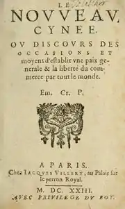 - Le Nouveau Cynée, ou Discours d'Estat représentant les occasions et moyens d'establir une paix généralle et la liberté du commerce par tout le monde sur Gallica