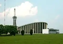 Les émetteurs sont abrités dans un bâtiment à l'architecture remarquable (photo 2), en béton précontraint recouvert de verre, sans piliers, conçu par les architectes J. F. Guédys et Eugène Freyssinet. La construction soulève des difficultés techniques complexes à l'époque. D'une longueur de 82 mètres et d'une largeur de 43 mètres, sa hauteur est comprise entre 5 et 16 mètres, pour une surface de 2 700 m2 et un volume de 31 000 m3 ; ses vitres s'étendent quant à elles sur 1 770 m2. Le chauffage du bâtiment est fait par la chaleur perdue des émetteurs.
