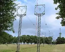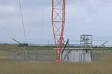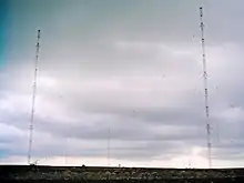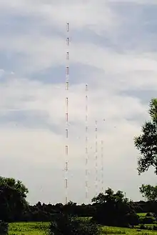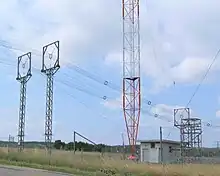 Le système principal (photo 5a), directionnel, est constitué par quatre pylônes en acier à section constante triangulaire, à 3 mètres de côté, soutenues par des haubans et dont les hauteurs sont comprises entre 270 et de 282 mètres (entre-axes : 350 mètres). Elles sont visibles à plusieurs kilomètres et signalées la nuit par un dispositif lumineux. La photo 6 montre les différents dispositifs de couplage avec l'antenne, divers dispositifs de protection (la foudre est notamment un problème classique, parfois responsable de coupures) ainsi que la cabine d'antenne renfermant des dispositifs de mesure. La base du pylône est isolée électriquement du sol. La prise de terre comprend des fils de cuivre disposés en rayon à partir des pylônes, de grande longueur (290 km au total), la bonne conductivité permettant de diminuer la perte d'énergie au niveau du sol.