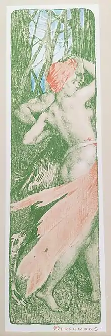 La lithographie est caractéristique d'Émile Berchmans, on y observe « le style et l'importance de ses figures nues, dont la beauté païenne ignore le mysticisme »[70] et des « êtres très proches de la nature - faunes, ægipans, satyres et nymphes - qui lui donnent son sens général et sa portée philosophique »[71]. Jules Bosmant continue : « Émile Berchmans a usé du nu féminin tantôt dans un clair langage symbolique, tantôt au titre d'harmonieux et explicatif complément d'un paysage stylisé. C'est pourquoi son nu est toujours chaste. Il ne connaît pas le péché, il est simple et innocent ; il insère dans des décors de nature, des gestes eurythmiques dépourvus d'intentions sexuelles, et son paganisme retrouve sans effort l'innocence des Temps antiques où la Vertu était nue. »[49].