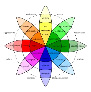 Les émotions primaires pourraient se mélanger pour former le spectre complet de l'expérience émotionnelle humaine. Par exemple, la colère interpersonnelle et le dégoût peuvent se mélanger pour former du mépris. Des relations existent entre les émotions de base, entraînant des influences positives ou négatives[34].Robert Plutchik était d'accord avec la perspective biologique d'Ekman mais a développé la « roue des émotions » (1980).