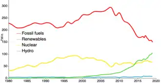 Durant les années 1940, environ 90 % de la capacité de la production électrique provient du charbon dont l’exploitation employait jusqu’à 718 000 mineurs[7], le pétrole fournissant le reste. Malgré les gisements de la mer du Nord à partir du milieu des années 1970, la transformation du pétrole en électricité est restée relativement faible. Puis l'utilisation du charbon s'est drastiquement réduite dans les années 1980 et 1990, au profit du gaz naturel, et, en 2002, on comptait seulement 12 000 mineurs[7]. En 1990, 1,09 % du gaz consommé dans le pays est utilisé dans la production d'électricité. En 2004, le chiffre était passé à 30,25 %. En 2004, l'utilisation du charbon dans les centrales électriques a diminué de 43,6 % (50,5 millions de tonnes, représentant 82,4 % du charbon utilisé en 2004) par rapport aux niveaux de 1980.