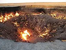 Le cratère de Darvaza (ou Derweze), situé dans le désert du Karakoum, brûle depuis un demi-siècle en rejetant dans l'atmosphère d'énormes quantités de méthane. Surnommé "la Porte de l'enfer", ce gouffre d'environ 70 mètres de diamètre et 30 mètres de profondeur serait le résultat d'une opération d'exploration gazière qui a mal tourné en 1971 : des ingénieurs soviétiques ont effectué un forage pour quantifier les réserves du site, mais le sol instable s'est effondré[14].