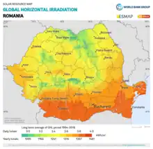La production photovoltaïque de la Roumanie en 2018, en progression de 0,2 %, se situe au 10e rang européen avec 1,5 % du total européen, loin derrière l'Allemagne (37,7 %), l'Italie (18,5 %), le Royaume-Uni (10,6 %), la France (8,3 %) et l'Espagne (6,4 %). En 2018, les nouvelles installations ont été de 2,9 MW, portant la puissance installée du parc solaire roumain à 1 377 MW, au 11e rang européen. La puissance installée par habitant est de 70,5 W, soit 31,5 % de la moyenne de l'Union européenne (223,6 W)[21].