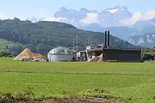 Du biogaz est injecté dans le réseau de gaz naturel depuis 1998[70]. Celui-ci peut être utilisé pour les mêmes applications que le gaz naturel[71],[72],[73]. Le biogaz est renouvelable, et il peut être produit en Suisse, à partir de purin, d'eaux usées ou de déchets verts[74]. Il est considéré comme neutre en CO2 car ses émissions sont équivalentes à celles de la biomasse utilisée si celle-ci avait pourri sans rien produire[75]. En 2022, 423 GWh de biogaz ont été injectés dans le réseau suisse, soit 1,5 % de la consommation finale de gaz[70]. En 2017, la part de biogaz dans le gaz naturel utilisé comme carburant était de plus de 20 %[76]. Dans le cadre de la Stratégie énergétique 2050, la part du biogaz devrait passer à 30 % en 2030, 50 % en 2040 et devrait avoir complètement remplacé le gaz naturel en 2050[77].