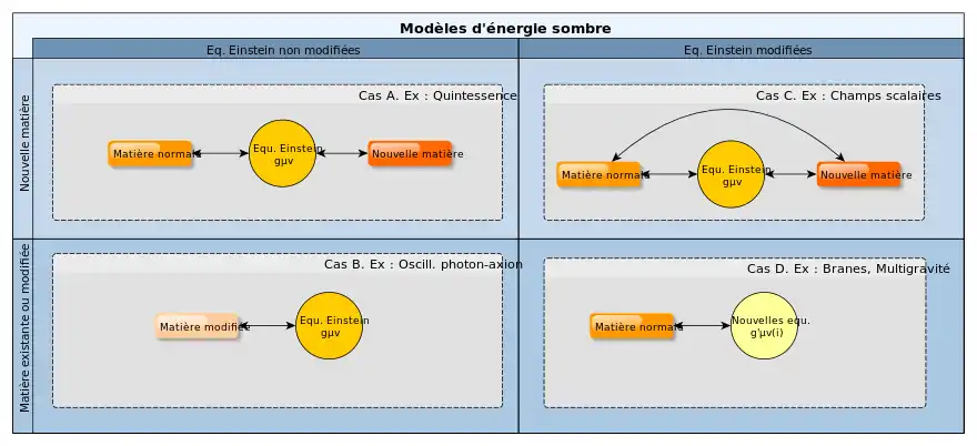 Les modèles d'énergie sombre, en dehors de la constante cosmologique, peuvent être classés en quatre classes principales[8]. Les deux premières classes font l'hypothèse que la gravitation est correctement décrite par la relativité générale et introduisent de nouveaux degrés de liberté par rapport au modèle standard.