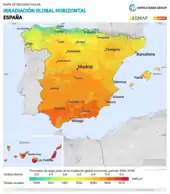 Alors que l'irradiation solaire annuelle globale horizontale (IGH) en France est en moyenne de 1 274 kWh/m² et celle de Provence-Alpes-Côte d'Azur de 1 645 kWh/m²[1], on peut constater sur la carte ci-contre que la majeure partie de l'Espagne dépasse largement 1 600 kWh/m² et que la partie sud (Andalousie) dépasse 1 900 kWh/m².