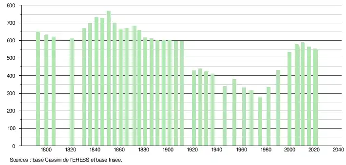 L'évolution du nombre d'habitants est connue à travers les recensements de la population effectués dans la commune depuis 1793. Pour les communes de moins de 10 000 habitants, une enquête de recensement portant sur toute la population est réalisée tous les cinq ans, les populations légales des années intermédiaires étant quant à elles estimées par interpolation ou extrapolation[23]. Pour la commune, le premier recensement exhaustif entrant dans le cadre du nouveau dispositif a été réalisé en 2005[24].