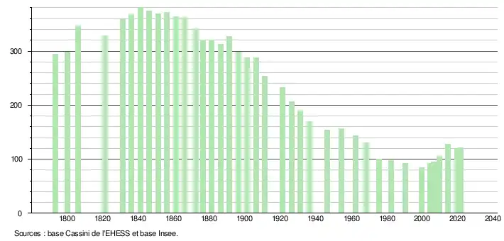 L'évolution du nombre d'habitants est connue à travers les recensements de la population effectués dans la commune depuis 1793. Pour les communes de moins de 10 000 habitants, une enquête de recensement portant sur toute la population est réalisée tous les cinq ans, les populations légales des années intermédiaires étant quant à elles estimées par interpolation ou extrapolation[19]. Pour la commune, le premier recensement exhaustif entrant dans le cadre du nouveau dispositif a été réalisé en 2004[20].