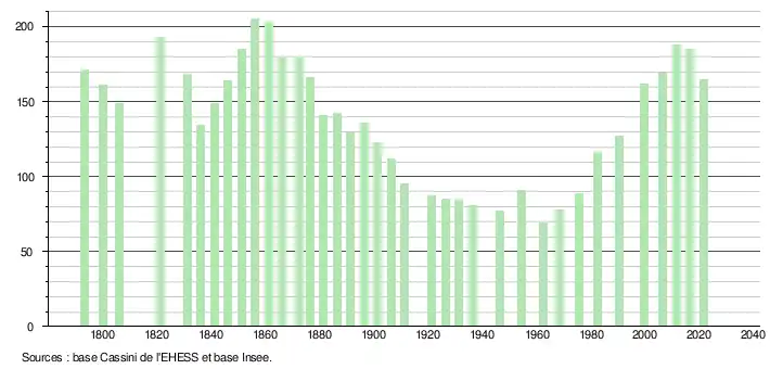 L'évolution du nombre d'habitants est connue à travers les recensements de la population effectués dans la commune depuis 1793. Pour les communes de moins de 10 000 habitants, une enquête de recensement portant sur toute la population est réalisée tous les cinq ans, les populations légales des années intermédiaires étant quant à elles estimées par interpolation ou extrapolation[13]. Pour la commune, le premier recensement exhaustif entrant dans le cadre du nouveau dispositif a été réalisé en 2006[14].