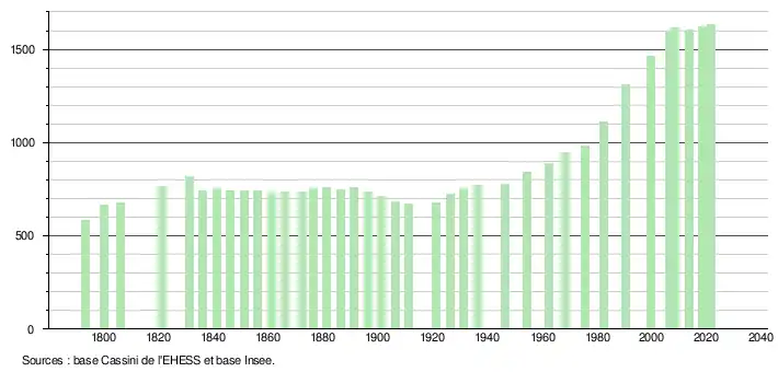 L'évolution du nombre d'habitants est connue à travers les recensements de la population effectués dans la commune depuis 1793. Pour les communes de moins de 10 000 habitants, une enquête de recensement portant sur toute la population est réalisée tous les cinq ans, les populations légales des années intermédiaires étant quant à elles estimées par interpolation ou extrapolation[19]. Pour la commune, le premier recensement exhaustif entrant dans le cadre du nouveau dispositif a été réalisé en 2008[20].