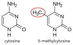 La méthylation de l'ADN est la modification épigénétique la plus étudiée par les chercheurs[17]. Ce processus consiste en l'ajout d'un groupement méthyle (CH3) à des nucléotides spécifiques sur le génome[18]. Cette modification sur les nucléotides du génome est faite par des enzymes spécifiques appelées ADN-méthyltransférases. Chez les différents taxons, la méthylation de l'ADN comporte de nombreuses différences, soit au niveau du type de nucléotides méthylés, adénine ou cytosine, ou à quelle position moléculaire le groupe méthyle s'ajoutera[18]. En effet, chez Eubacteria et Archaea, la méthylation se produit sur l'adénine alors que chez les Eukaryota, la seule modification de l'ADN convaincante est la méthylation qui se produit en position C5 de la cytosine. Par contre, la méthylation en position C5 de la cytosine est commune dans tous les domaines de vie[18].