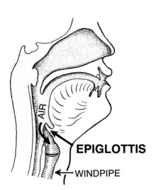 L'épiglotte est constitué de la partie supérieure du cartilage épiglottique recouverte de muqueuse sur ses deux faces. Elle a la forme d'une feuille dont le rameau, antérieur, s'insère dans l'échancrure du cartilage thyroïde. L'extrémité postérieure est orientée vers le haut à l'état basal, ce qui permet la respiration en laissant l'air circuler entre le pharynx et le larynx.