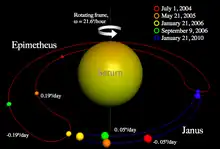 Les orbites d'Épiméthée et de Janus ne sont distantes que d'environ 50 km et, vu leurs dimensions excédant les 100 km de large, ils ne pourraient passer l'un à côté de l'autre sans se heurter. De fait, ils ne s'approchent jamais à moins de 10 000 kilomètres : tous les quatre ans environ, ils se rapprochent l'un de l'autre et décalent leurs orbites : le plus intérieur devient le plus extérieur et inversement. Les derniers échanges ont eu lieu en 2006 et en 2010. Ils suivent chacun une orbite en fer à cheval : vu depuis chacun des deux, l'autre semble faire demi-tour et ne pas faire le tour de Saturne.