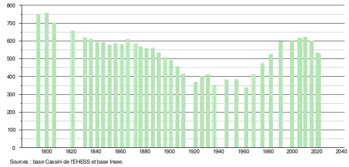 L'évolution du nombre d'habitants est connue à travers les recensements de la population effectués dans la commune depuis 1793. Pour les communes de moins de 10 000 habitants, une enquête de recensement portant sur toute la population est réalisée tous les cinq ans, les populations légales des années intermédiaires étant quant à elles estimées par interpolation ou extrapolation[18]. Pour la commune, le premier recensement exhaustif entrant dans le cadre du nouveau dispositif a été réalisé en 2005[19].