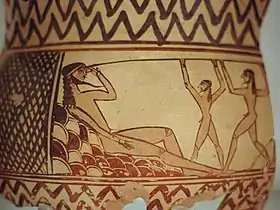 Comme souvent la confrontation aux « Autres » contribue à l'émergence d'un sentiment d'identité, et à l'époque archaïque commence à transparaître une forme d'identité grecque, par opposition aux non-Grecs, les « Barbares »[176]. Cela reste cependant limité avant le Ve siècle, puisqu'avant cela le terme est très peu employé, et qu'il prend surtout son sens avec la période des guerres médiques qui offre l'occasion à la coalition s'opposant aux Perses de formuler une première forme d'identité grecque face à l'envahisseur. C'est en particulier visible à Athènes au Ve siècle, quand la cité a pris la tête de lutte contre l'empire oriental et s'en sert donc pour des motifs politiques. Mais rien n'indique qu'il y ait eu une telle ferveur ailleurs, et d'une manière générale la notion de Barbares n'a pas empêché les échanges culturels et relations diplomatiques, même avec la Perse. Dans le contexte athénien, la critique des mœurs « barbares » est peut-être aussi une manière de viser les élites, par le biais de leur goût pour les choses « orientalisantes » qui est un moyen d'affirmer leur prestige social, attitude visible durant l'époque archaïque, et beaucoup moins par la suite[177].