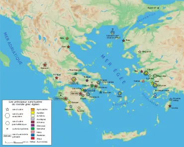 Les sanctuaires sont les espaces qui se distinguent le plus rapidement dans les territoires civiques. Les temples grecs se dotent à l'époque archaïque de leurs aspects caractéristiques. Ils deviennent des éléments marquants des paysages des cités, qui y investissent des ressources considérables[107]. Les sanctuaires majeurs ne sont pas forcément situés en ville : plusieurs cas de sanctuaires extra-urbains situés aux marges de la cité sont identifiés, comme celui de l'isthme de Corinthe ; ils servent à marquer le fait que ces espaces marginaux sont placés sous le contrôle de la cité qui les y a érigés[108]. En dehors de leur territoire, les cités se mettent également en avant dans les grands lieux de culte panhelléniques (Delphes, Olympie), où les plus riches et puissantes érigent des « trésors » (thesauroi), édifices contenant leurs offrandes, à l'architecture souvent soignée de manière à affirmer le prestige d'une cité face aux voisines qui ont leur propre trésor à côté[109].