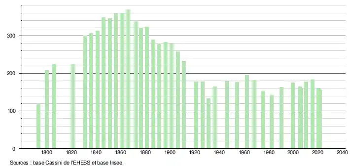 L'évolution du nombre d'habitants est connue à travers les recensements de la population effectués dans la commune depuis 1793. Pour les communes de moins de 10 000 habitants, une enquête de recensement portant sur toute la population est réalisée tous les cinq ans, les populations légales des années intermédiaires étant quant à elles estimées par interpolation ou extrapolation[17]. Pour la commune, le premier recensement exhaustif entrant dans le cadre du nouveau dispositif a été réalisé en 2005[18].