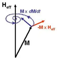 C'est l'équation de Landau-Lifshitz-Gilbert (LLG), où η est le paramètre d'amortissement, qui est caractéristique du matériau. On peut retrouver l'équation de Landau-Lifshitz[4] :