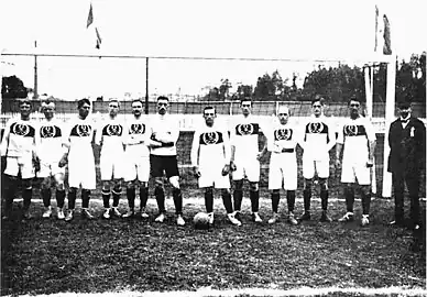 La Fédération allemande de football (Deutscher Fußball-Bund) est fondée en 1900, puis affiliée à la FIFA en 1904. Le premier match officiel de l’équipe d'Allemagne de football (Deutsche Fußballnationalmannschaft) fut joué à Bâle, contre la Suisse, le (défaite allemande sur le score de 5 buts à 3)[10]. La plus large défaite de l’Allemagne fut enregistrée à Oxford, contre l’Angleterre (amateur), le (9-0). La plus large victoire de l’Allemagne fut enregistrée à Stockholm contre la Russie (Empire russe) sur le score de 16 buts à 0, le 1er juillet 1912.