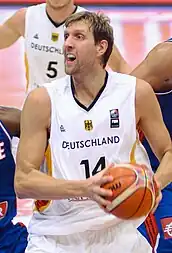 Après avoir raté les Jeux olympiques de 2000, l’Allemagne se qualifie pour l’EuroBasket 2001. Le premier match de l’équipe est contre l’Estonie, dans lequel Dirk Nowitzki marque 33 points et prend 12 rebonds pour mener l’Allemagne à une victoire 92 à 71[28]. Après sa victoire, l’Allemagne remporte deux de ses trois matchs suivants. En quart de finale contre la France, les 32 points de Nowitzki aident l’équipe à se qualifier en demi-finale contre la Turquie. Le parcours de l’Allemagne se termine en demi, après avoir perdu après prolongation contre les Turcs 78-79[29]. Avec la médaille de bronze encore possible, l'équipe nationale allemande s'incline dans le match pour la troisième place face à l'Espagne du jeune espoir espagnol Pau Gasol[30].