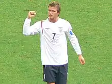 Dans un groupe de qualifications pour la Coupe du monde 2006 qui comprend la Pologne, l'Autriche, le Pays de Galles, l'Irlande du Nord et l'Azerbaïdjan, l'Angleterre termine première devant la Pologne et se qualifie[31]. L'Angleterre passe aisément le premier tour, terminant première du groupe avec un 1-0[c 63] contre le Paraguay, un 2-0[c 64] contre Trinité-et-Tobago et un 2-2[c 64] contre la Suède. Elle remporte par la suite son huitième de finale contre l'Équateur 1-0[c 65] grâce à un coup franc de Beckham. L'Angleterre échoue contre le Portugal aux tirs au but après un 0-0[c 65], en quart de finale à Gelsenkirchen. Wayne Rooney est exclu de la rencontre alors que Cristiano Ronaldo, son coéquipier à Manchester United, influence la décision de l'arbitre. Le gardien portugais Ricardo arrête les tirs de Lampard, Gerrard et Carragher.
