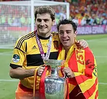 La Roja commence le tournoi européen en Pologne par un match nul avec l’Italie (1-1) suivi d'une victoire sur l’Irlande (4-0). Affichant une fébrilité étonnante, elle parvient toutefois à se qualifier pour les quarts de finale en battant la Croatie (1-0)[52]. Elle bat la France (2-0) au bout d'un match fermé, puis est accrochée en demi-finale par le Portugal (0-0 ap). L'Espagne doit s'en remettre aux tirs au but (4-2) pour jouer sa deuxième finale consécutive de championnat d'Europe. Elle retrouve en finale l'Italie, qu'elle écrase cette fois 4-0. Le score face à l'Italie constitue le plus gros écart de buts dans une finale européenne ou mondiale. La Roja, première sélection à conserver un titre européen, signe un triplé Euro-Mondial-Euro inédit dans l'histoire du football[53].