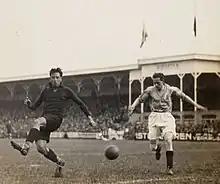 (à gauche) et Leo Ghering (nl) à la pointe d'une attaque des Pays-Bas vers le but des Belges, défaits (3-1), à l'occasion du tournoi de consolation (à droite).