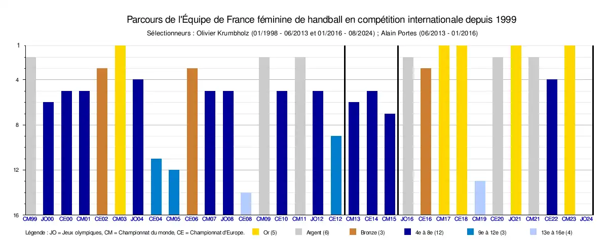 Avec le même entraîneur, Olivier Krumbholz, cette sélection remporte à partir de 1999, treize médailles dans les grands événements internationaux, dont un premier titre au Championnat du monde 2003 en Croatie et un deuxième, quatorze ans plus tard, au Championnat du monde 2017 en Allemagne, plus d'un an après avoir enlevé la médaille d'argent aux Jeux olympiques d'été de 2016 à Rio de Janeiro, au Brésil. Exceptionnellement, les équipes nationales de handball masculine et féminine sont championnes du monde la même année. Comme leurs homologues masculins en 2010 et 2015, les Bleues détiennent simultanément en 2018 les titres mondial et européen, après leur première victoire sur la scène continentale, à domicile à Bercy le en finale face à la Russie. Cette victoire leur permet de se qualifier directement pour les Jeux olympiques de Tokyo 2020, où elles atteignent leur deuxième finale consécutive, avant de remporter leur premier titre olympique face aux joueuses du comité olympique de Russie le 8 août 2021, sur le score de 30-25. Elles deviennent par la même occasion la première sélection féminine française de sport collectif championne olympique.