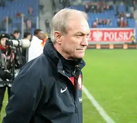 Après la désillusion de l'élimination dès les éliminatoires de la coupe du monde 2010, l'objectif principal de la fédération polonaise (PZPN) est de mettre en place une équipe pour « son » Euro 2012, organisé conjointement avec l'Ukraine. La majorité des supporteurs polonais souhaite que le nouveau sélectionneur soit un Polonais[134]. Le poste s'est disputé entre Franciszek Smuda et Henryk Kasperczak[135],[136],[137]. Le , Franciszek Smuda succède à Stefan Majewski[138]. Au début de l'année 2010, l'équipe de Pologne participe à la King's Cup, avec une équipe composée uniquement de joueurs évoluant en club en Pologne. Elle parvient à terminer 2e de la compétition derrière le Danemark, contre lequel elle a perdu 1-3. Qualifiée d'office pour le championnat d'Europe en tant qu'organisatrice, elle ne dispute de fin 2010 à mi-2012 que des matchs amicaux. Les performances de l'équipe de Pologne sont marquées par le duo que forment Jakub Błaszczykowski et Robert Lewandowski, qui évoluent ensemble au Borussia Dortmund.