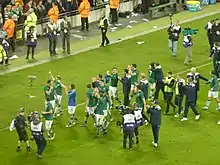 L'Italien Giovanni Trapattoni, un des entraîneurs les plus réputés et expérimentés d'Europe, est nommé en [36]. L'Irlande termine invaincue de son groupe de qualification pour la Coupe du monde 2010, mais avec seulement quatre victoires, elle doit passer par un barrage face à la France[37]. Battus chez eux à Dublin (1-0), les Irlandais dominent largement le match retour. Alors qu'ils mènent 1-0 en fin de match, les Français égalisent par William Gallas, qui profite d'une action de jeu marquée par une main de Thierry Henry[38]. L'action et le résultat du barrage font scandale[39].
