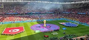 Le premier match contre l'Angleterre[252] se conclut par une victoire de cette dernière (2-1)[253]. L'Angleterre marque à la 11e minute lorsque Mouez Hassen arrête une tête de John Stones sur un corner de la gauche, mais ne peut pas sauver un suivi de Harry Kane à bout portant. Hassen est remplacé quatre minutes plus tard par Farouk Ben Mustapha en raison d'une blessure plus tôt dans le match, après une collision avec Jesse Lingard. Lingard frappe ensuite une volée du centre d'Ashley Young au deuxième poteau[254]. Après dix minutes, Ferjani Sassi égalise sur penalty après que Kyle Walker ait été pénalisé d'un coup de coude sur Fakhreddine Ben Youssef[255]. Kane fait appel à un penalty dans les cinq minutes qui suivent la reprise alors qu'il a été apparemment gêné par une paire de joueurs tunisiens dans un corner. Dans le temps additionnel, Harry Maguire décoche un corner de Kieran Trippier de la droite dans le chemin de Kane[256], qui le dirige à l'intérieur du but après avoir été laissé libre au deuxième poteau[257].