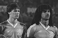 Les Pays-Bas, emmenés par Ruud Gullit, John Bosman, Frank Rijkaard et Marco van Basten, réussissent enfin à se qualifier pour une compétition majeure en remportant facilement leur groupe de qualification pour l'Euro 1988 devant la Grèce, la Hongrie, la Pologne et Chypre[65]. Rinus Michels reprend les rênes de l'équipe nationale pour la phase finale en Allemagne de l'Ouest. Ils tombent dans le groupe de l'Union soviétique, de l'Irlande et de l'Angleterre. Ils commencent mal avec une défaite contre les Soviétiques (0-1), puis battent l'Angleterre (3-1, triplé de van Basten[note 3]) et l'Irlande (1-0, but de Wim Kieft à la 82e minute de jeu). Ils terminent deuxièmes du groupe, et affrontent le pays organisateur en demi-finale pour une revanche de la finale de la Coupe du monde 1974. L'Allemand Lothar Matthäus ouvre la marque sur penalty avant que Ronald Koeman ne lui réponde. Marco van Basten marque à la 89e minute de jeu et coule l'équipe allemande (2-1). La victoire est ternie par le comportement d'après-match de Ronald Koeman, qui, devant les supporteurs allemands, feint de s'essuyer le derrière avec le maillot d'Olaf Thon comme s'il s'agissait de papier toilette[66].