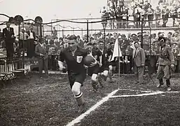 En 1934, les Pays-Bas se qualifient pour leur première Coupe du monde en écartant l'Irlande (5-2) puis la Belgique (4-2), dont quatre buts signés Beb Bakhuys[25]. Deux semaines avant la phase finale, ils perdent un match de préparation à domicile contre la France de Jean Nicolas (4-5) après avoir mené trois buts à zéro[26]. En Italie, l'équipe est éliminée en huitième de finale par les Suisses (2-3) au stadio Comunale di San Siro, les premiers buteurs néerlandais en phase finale de Coupe du monde étant Kick Smit et Leen Vente[27].