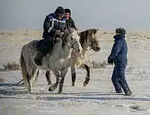 Débourrage d'un cheval par tentative d'acceptation directe d'un cavalier (ici, en Mongolie), une méthode controversée.