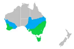 C'est un oiseau modérément commun dans le bassin Murray-Darling et du Cooper Creek et dans les zones fertiles les plus humides du sud du continent: la partie sud-ouest de l'Australie-Occidentale, le Victoria et la Tasmanie. Ils évitent l'extrême nord ou l'ouest et le nord-ouest trop arides.