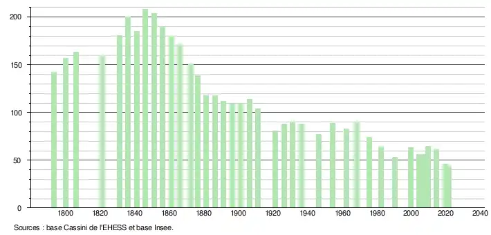 L'évolution du nombre d'habitants est connue à travers les recensements de la population effectués dans la commune depuis 1793. Pour les communes de moins de 10 000 habitants, une enquête de recensement portant sur toute la population est réalisée tous les cinq ans, les populations légales des années intermédiaires étant quant à elles estimées par interpolation ou extrapolation[16]. Pour la commune, le premier recensement exhaustif entrant dans le cadre du nouveau dispositif a été réalisé en 2004[17].