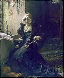- L'érotomanie peut être mystique[30],[31]. Par exemple, le patient est convaincu d'être aimé de Dieu en personne par élection, à l'instar du Président Schreber mais d'une façon moins patente[31]. Souvent nourrie par le catéchisme, la prière, le mysticisme et parfois la vie monastique à l'insu des instances ecclésiastiques, cette conviction illustre un tableau clinique proche du délire de relation des sensitifs.