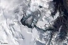 Vue du panache volcanique s'élevant au-dessus du volcan le 17 avril 2010 au cours de la seconde phase éruptive. | |