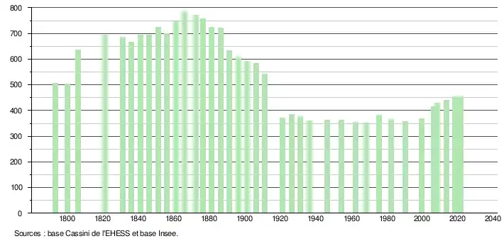 L'évolution du nombre d'habitants est connue à travers les recensements de la population effectués dans la commune depuis 1793. Pour les communes de moins de 10 000 habitants, une enquête de recensement portant sur toute la population est réalisée tous les cinq ans, les populations légales des années intermédiaires étant quant à elles estimées par interpolation ou extrapolation[35]. Pour la commune, le premier recensement exhaustif entrant dans le cadre du nouveau dispositif a été réalisé en 2008[36].