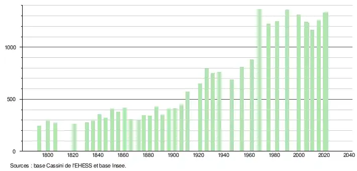 L'évolution du nombre d'habitants est connue à travers les recensements de la population effectués dans la commune depuis 1793. Pour les communes de moins de 10 000 habitants, une enquête de recensement portant sur toute la population est réalisée tous les cinq ans, les populations légales des années intermédiaires étant quant à elles estimées par interpolation ou extrapolation[25]. Pour la commune, le premier recensement exhaustif entrant dans le cadre du nouveau dispositif a été réalisé en 2005[26].
