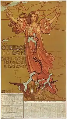 En 1869, un traité d'État est signé entre la Suisse, l'Italie et l'Empire allemand pour la construction d'une ligne à travers le massif du Gothard. Les travaux commencent trois ans plus tard et durent plus de 10 ans pendant lesquels les 15 kilomètres du tunnel proprement dit ainsi que les rampes d'accès à celui-ci sont considérés comme des prodiges de la technique moderne ; cette entreprise coûtera toutefois la vie à 177 des 2 480 travailleurs engagés sur le chantier[57], dont quatre tués par l'armée, engagée à la suite d'une grève des travailleurs pour protester contre leurs conditions de travail[nhss 16]. Peu après le percement du Gothard, suivront le tunnel du Simplon, soutenu financièrement et politiquement par la France en 1906, puis le tunnel du Lötschberg en 1913.