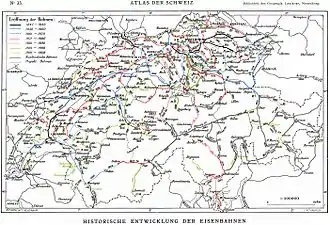 Comparée aux pays voisins, la construction du chemin de fer débute tardivement en Suisse, principalement à cause des difficultés techniques liées au relief ainsi qu'aux complications douanières intérieures : la première ligne nationale, reliant Zurich à Baden sur 30 km et appelée familièrement Spanisch-Brötli Bahn, date de 1847 seulement[bouquet 2].