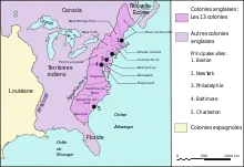 Au cours des XVIIe et XVIIIe siècles se forment progressivement les treize Colonies britanniques de la côte orientale, ancêtres des États-Unis (carte). La colonisation est assurée par des compagnies et un système de chartes. Les Français explorent la vallée du Mississippi et fondent la Louisiane. L'Amérique du Nord devient rapidement un enjeu entre les puissances coloniales : l'Angleterre (devenue la Grande-Bretagne en 1707 à la suite de son unification avec l'Écosse) assure peu à peu sa suprématie en remportant les guerres anglo-néerlandaises puis la guerre de Sept Ans (1763) contre la France, qui perd ses possessions de l'est du Mississippi (carte). Le peuplement se fait essentiellement par des migrants britanniques et par la traite négrière. Les esclaves noirs sont employés dans les plantations de tabac du sud mais aussi pour le développement des infrastructures. Vers 1775, les treize colonies sont prospères et comptent plus de deux millions d'habitants.