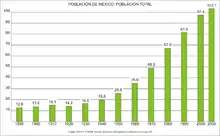 Avec une population estimée à environ 130 millions d'habitants en 2024, le Mexique se classe au dixième rang mondial des pays les plus peuplés. Plus de 99 % des Mexicains parlent l'espagnol mexicain (soit comme langue maternelle ou langue seconde), ce qui en fait le pays où vivent le plus d'hispanophones. Plus de 7 millions (environ 6 %) d'habitants parlent une langue autochtone, et parmi eux moins de 1 % sont monolingues[19] ; la loi mexicaine reconnaît les langues autochtones mexicaines comme langues nationales depuis 2003, mais aucune ne possède le statut de langue officielle.
