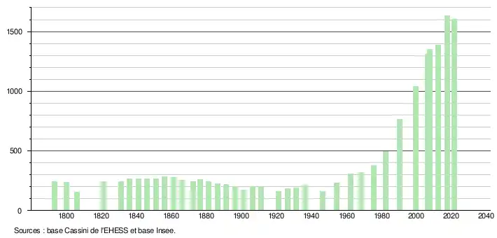 L'évolution du nombre d'habitants est connue à travers les recensements de la population effectués dans la commune depuis 1793. Pour les communes de moins de 10 000 habitants, une enquête de recensement portant sur toute la population est réalisée tous les cinq ans, les populations légales des années intermédiaires étant quant à elles estimées par interpolation ou extrapolation[38]. Pour la commune, le premier recensement exhaustif entrant dans le cadre du nouveau dispositif a été réalisé en 2007[39].