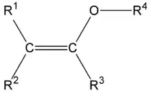 Un éther d’énol est un alcène avec un substituant alkoxy donc de structure générale R1R2C=CR3–O–R4 avec R un groupe alkyle ou aryle. Les éthers d'énol comme les énamines sont des alcènes activés ou alcènes riches en électron à cause de l'atome d'oxygène (ou d'azote pour les énamines) qui partage ses doublets libres avec la double liaison et forme une structure de résonance avec l'ion oxonium correspondant. Cette propriété rend les substrats réactifs dans certaines réactions organiques telles que la réaction de Diels-Alder. Un éther d'énol peut être considéré comme l'éther de l'énolate correspondant, d'où son nom. Deux éthers d'énol simples sont l'éthylvinyléther et le 2,3-dihydrofurane.