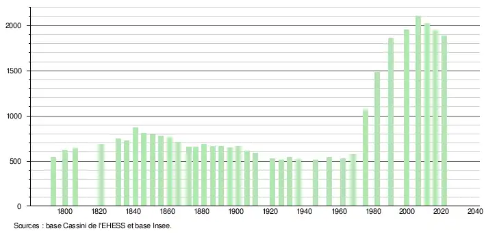L'évolution du nombre d'habitants est connue à travers les recensements de la population effectués dans la commune depuis 1793. Pour les communes de moins de 10 000 habitants, une enquête de recensement portant sur toute la population est réalisée tous les cinq ans, les populations légales des années intermédiaires étant quant à elles estimées par interpolation ou extrapolation[20]. Pour la commune, le premier recensement exhaustif entrant dans le cadre du nouveau dispositif a été réalisé en 2006[21].
