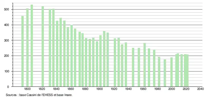 L'évolution du nombre d'habitants est connue à travers les recensements de la population effectués dans la commune depuis 1793. Pour les communes de moins de 10 000 habitants, une enquête de recensement portant sur toute la population est réalisée tous les cinq ans, les populations légales des années intermédiaires étant quant à elles estimées par interpolation ou extrapolation[16]. Pour la commune, le premier recensement exhaustif entrant dans le cadre du nouveau dispositif a été réalisé en 2008[17].